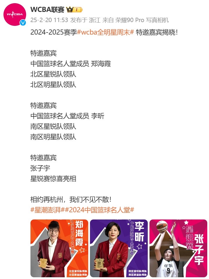 2025-02-20 18:59:39官方:鄭海霞、李昕、張子宇受邀成WCBA全明星特邀嘉賓