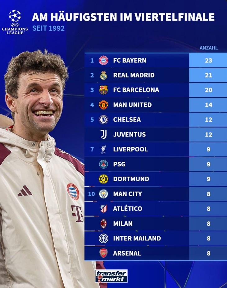 2025-03-13 21:01:34歐冠改制以來進(jìn)入8強(qiáng)次數(shù)榜:拜仁23次居首,皇馬次席,巴薩第三