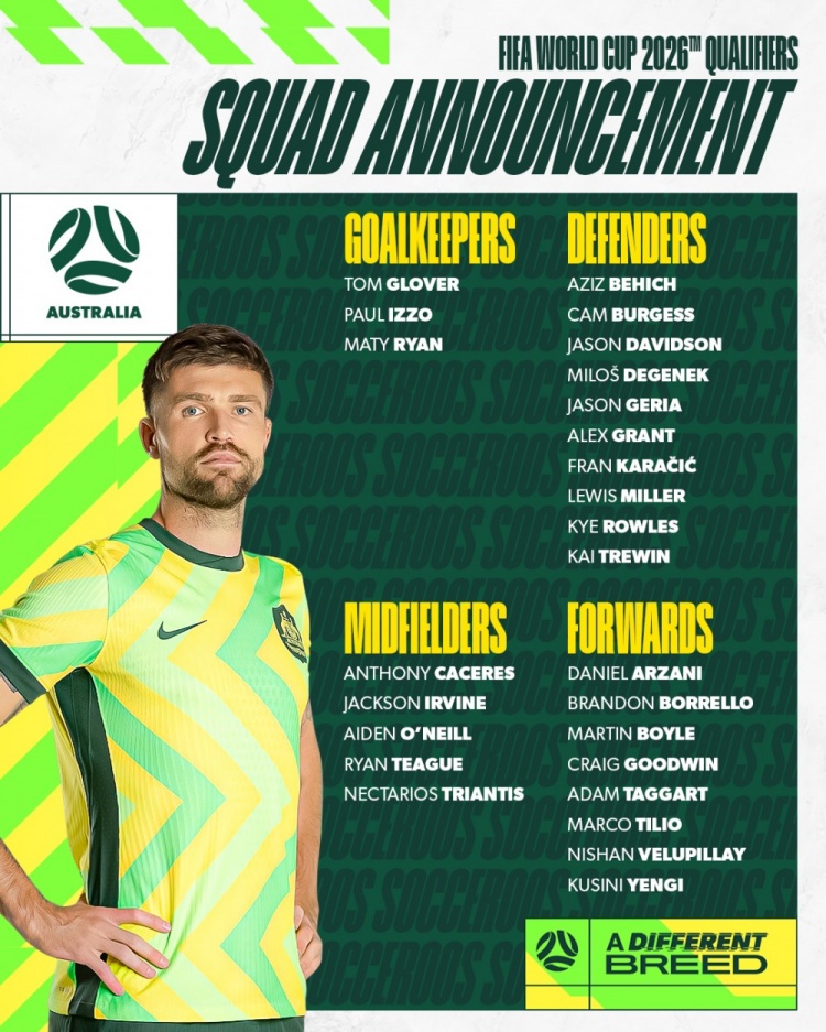 2025-03-14 14:01:20澳大利亞隊世預(yù)賽名單:“人民球王”古德溫領(lǐng)銜,3月25號對國足