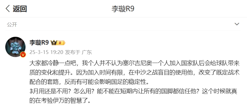 李璇寫道:大家都冷靜一點吧,我個人并不認(rèn)為塞爾吉尼奧一個人加入國家隊后會給球隊帶來質(zhì)的變化和提升。因為加入時間有限,在中沙之戰(zhàn)盲目的使用他,改變了既定戰(zhàn)術(shù)配合的套路,反而有可能會影響國足的穩(wěn)定性。