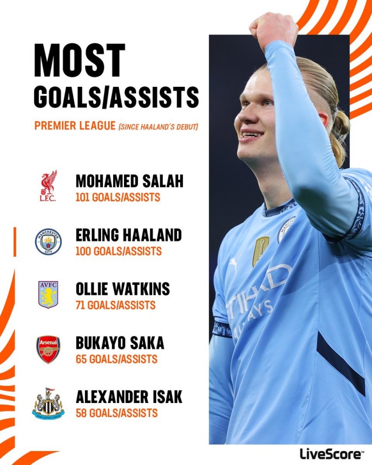 2025-03-16 00:02:21哈蘭德參與100球!同期英超參與進球榜:薩拉赫101球,薩卡在列