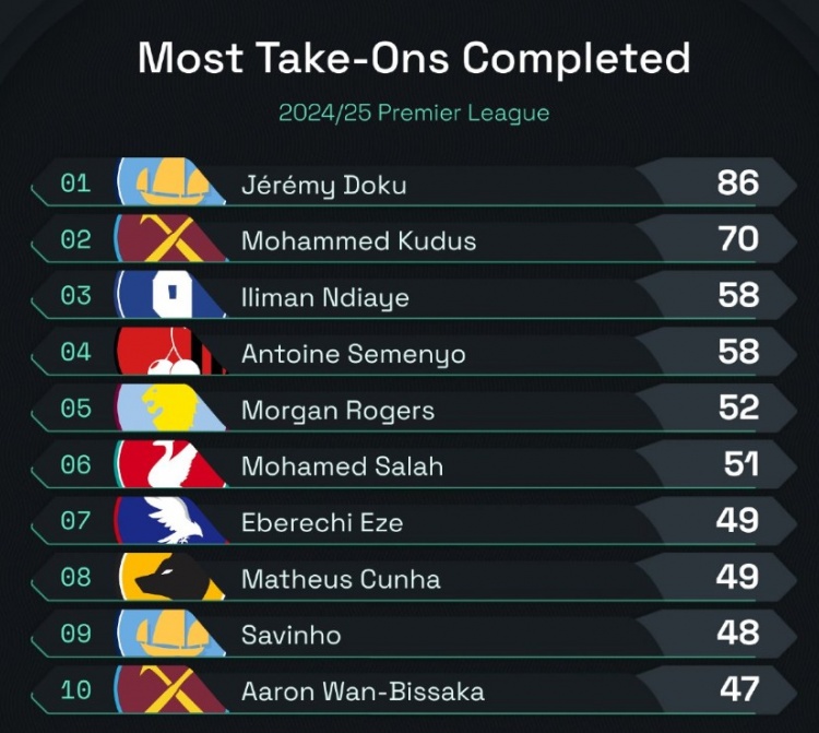 2025-03-16 07:00:11本賽季英超成功過(guò)人榜:多庫(kù)86次領(lǐng)跑,薩拉赫、薩維尼奧在列