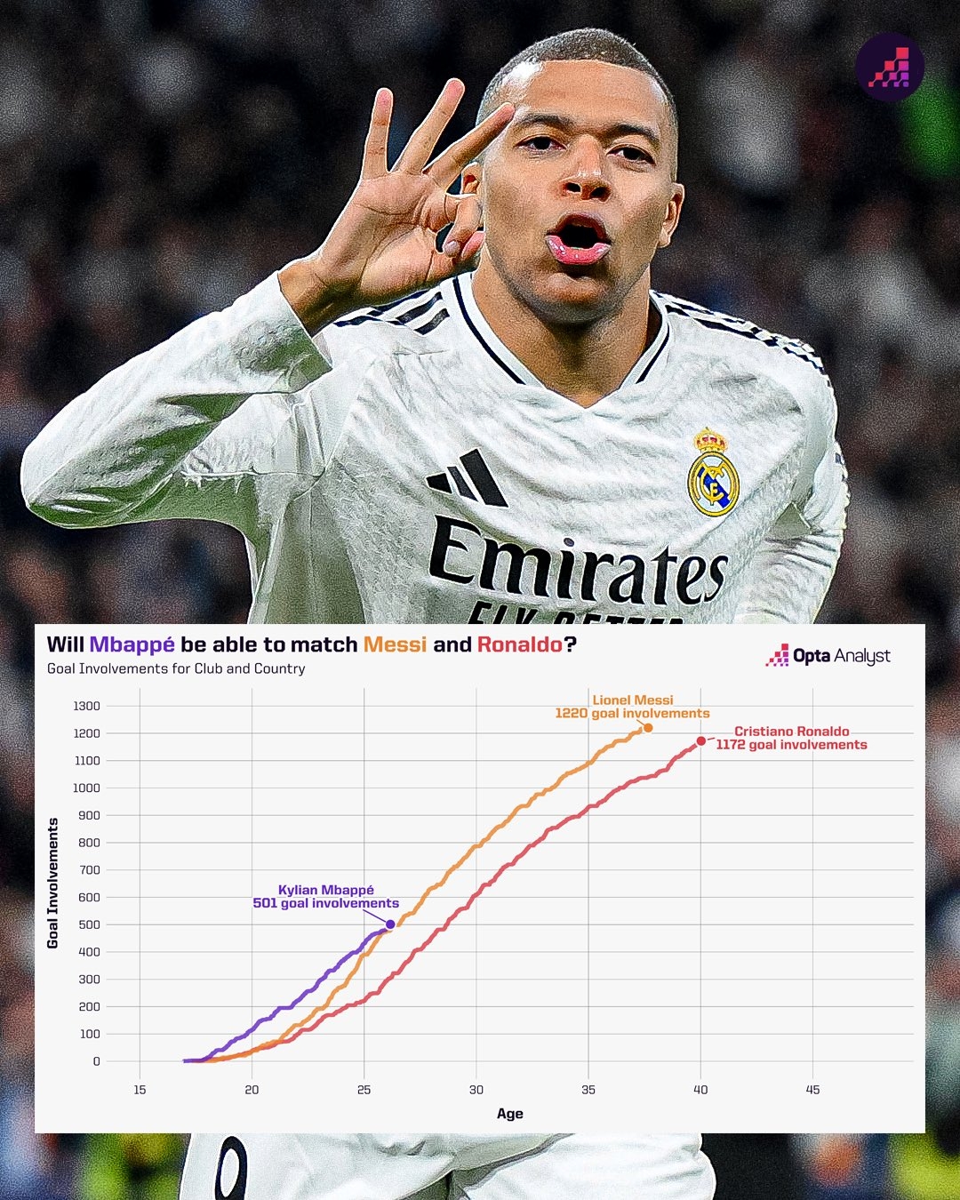2025-02-21 21:01:09梅羅均破千!姆巴佩生涯直接參與501球 與同年齡梅西相當(dāng)&高于C羅