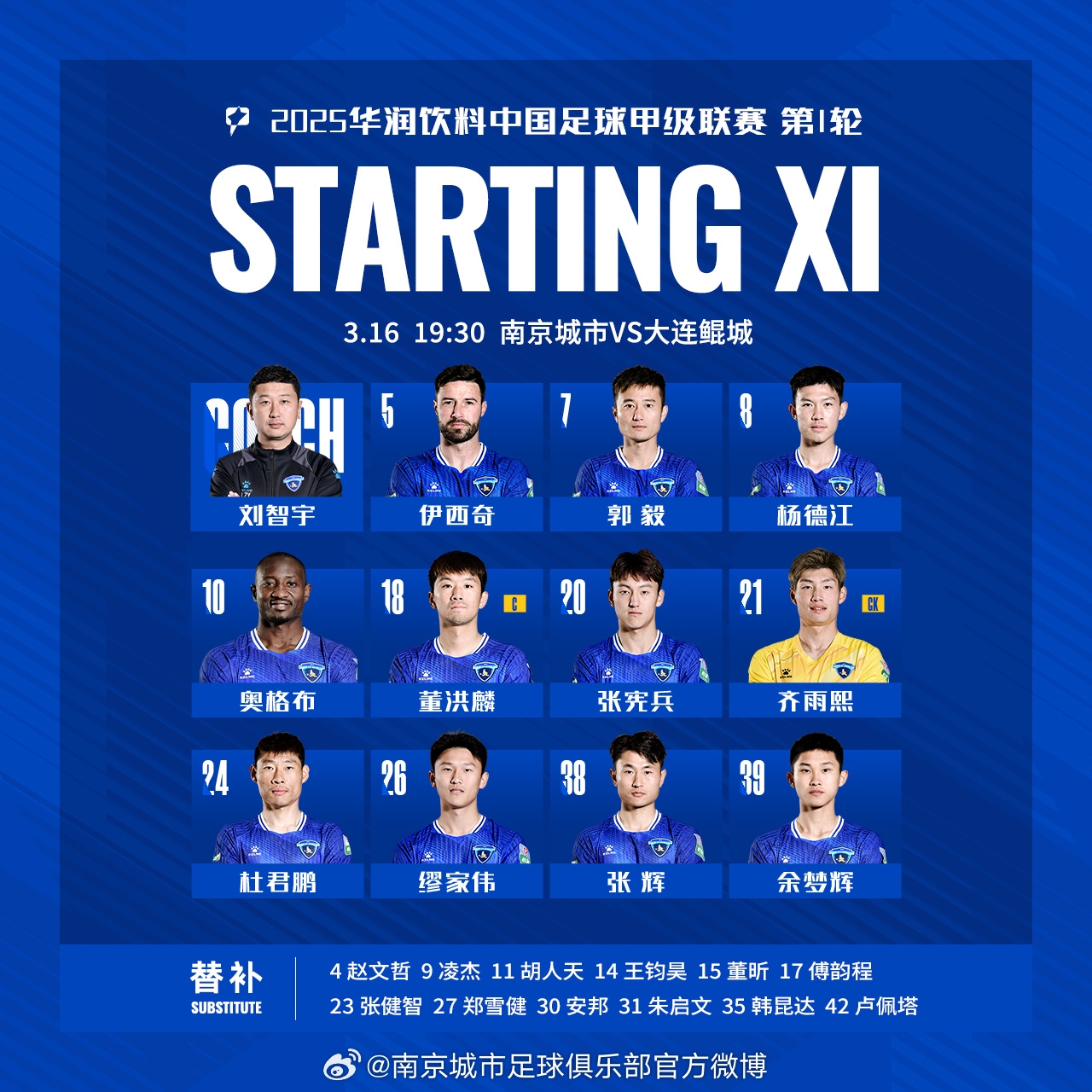 2025-03-16 21:01:04南京城市2025賽季首戰(zhàn)首發(fā)名單出爐!