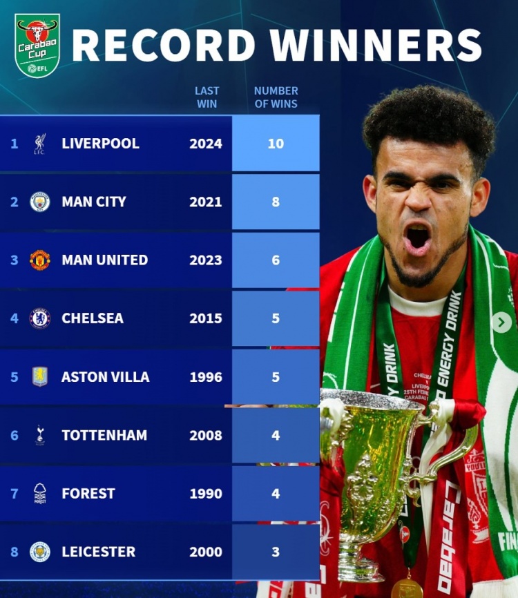 2025-03-16 21:01:15聯(lián)賽杯歷史奪冠榜:利物浦10冠居首,曼城8冠、曼聯(lián)6冠