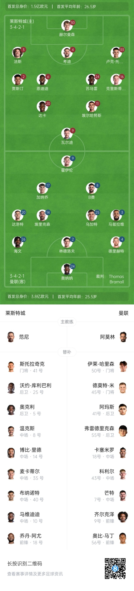 2025-03-17 07:07:14范尼戰(zhàn)舊主!曼聯(lián)vs萊斯特城首發(fā):霍伊倫加納喬出戰(zhàn),瓦爾迪先發(fā)