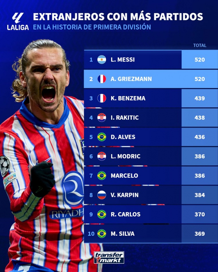 2025-03-17 21:00:31西甲歷史外援出場榜:梅西、格列茲曼520場居首,本澤馬439場第三