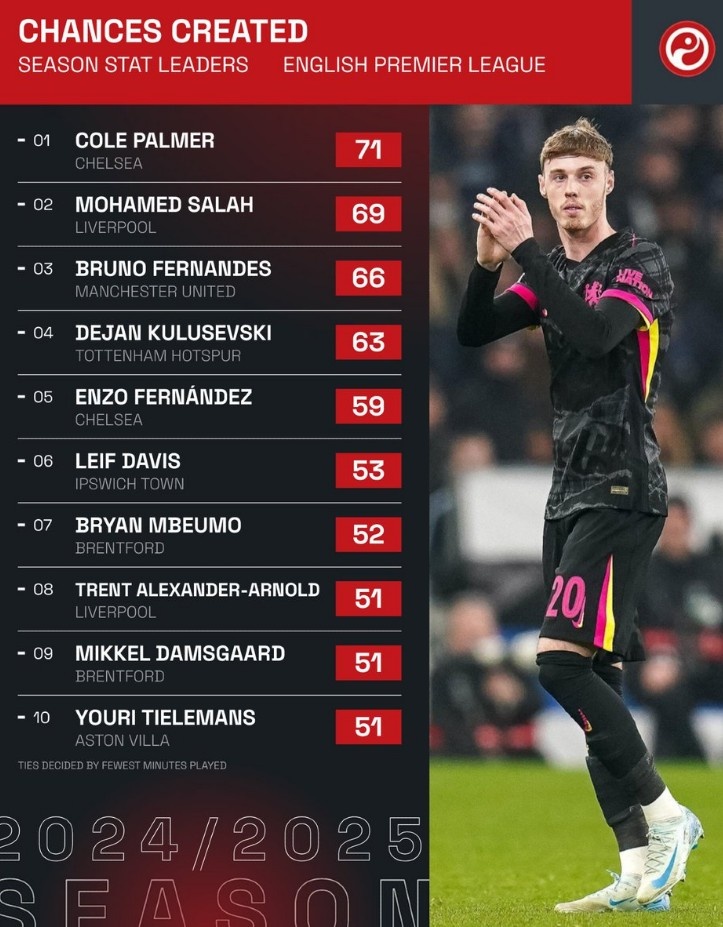 2025-03-17 21:00:56本賽季英超創(chuàng)造機(jī)會(huì)榜:帕爾默居首,薩拉赫次席,B費(fèi)第三