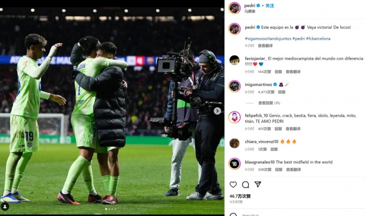 佩德里也曬出自己和隊(duì)友的相擁慶祝照,并配文:“這支球隊(duì)????????(狀態(tài)火爆),多么棒的勝利!太瘋狂了!”
