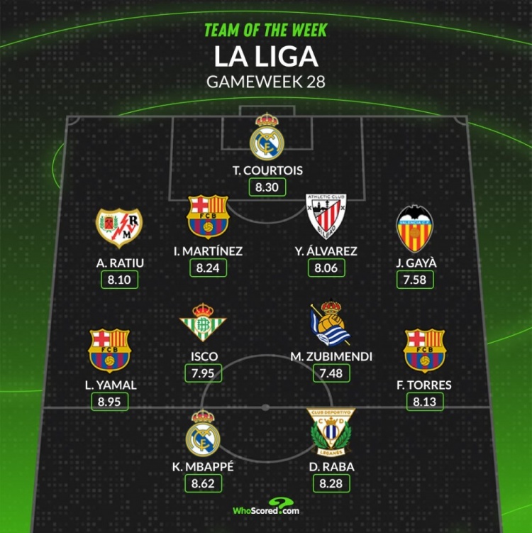 2025-03-17 21:01:34whoscored本周西甲最佳陣:姆巴佩、亞馬爾領銜,費蘭、褲襪在列