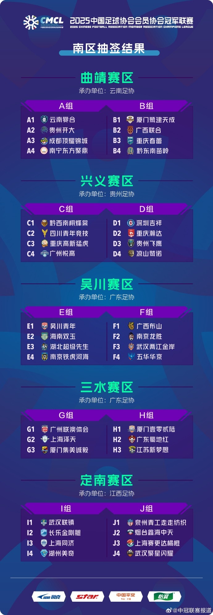 2025-03-18 00:04:01中冠聯(lián)賽南區(qū)分組:38隊分10組,廈門鷺建天成、黔東南苗嶺同組