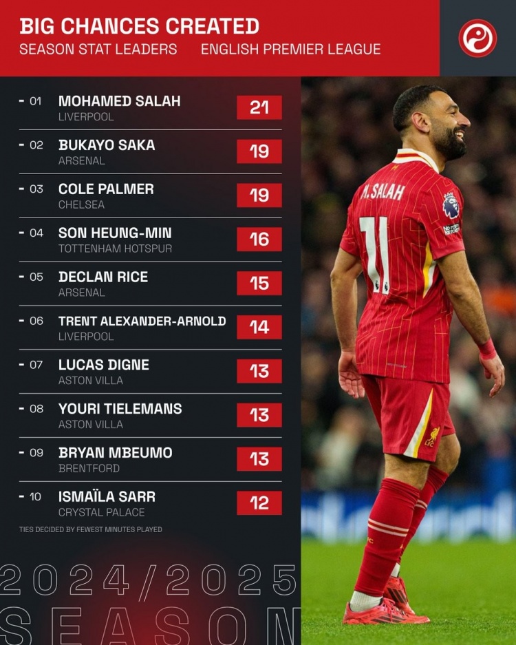 2025-03-18 07:00:29本賽季英超創(chuàng)造重大機會榜:薩拉赫21次居首,薩卡&帕爾默19次