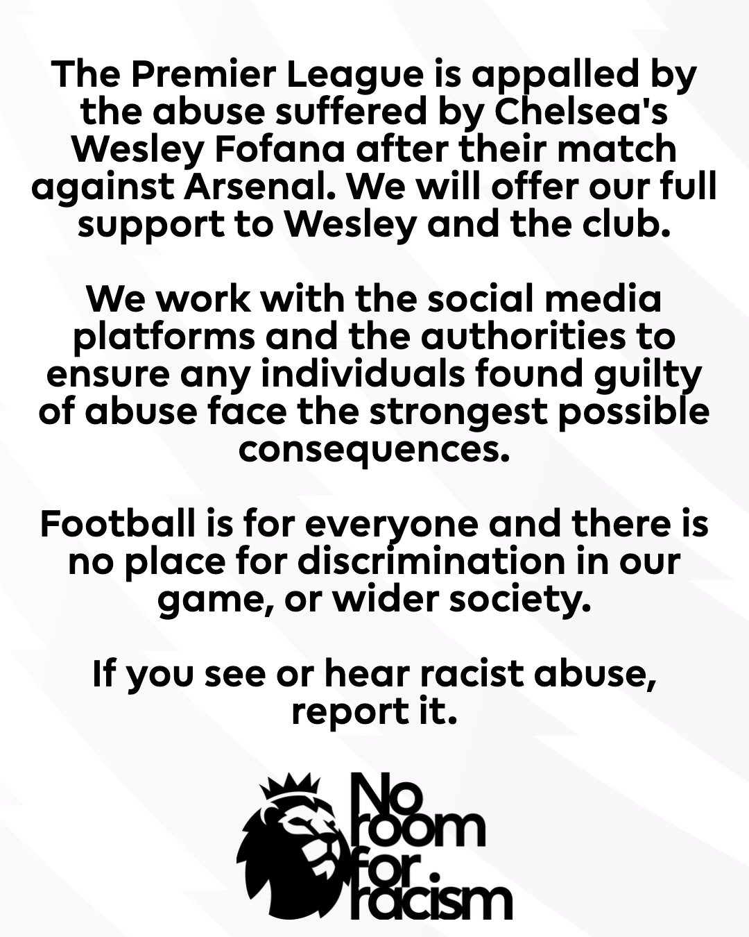英超官方寫道:在切爾西對(duì)陣阿森納的比賽后,福法納遭到了辱罵,英超聯(lián)賽對(duì)此深感震驚。我們將全力支持福法納及切爾西俱樂部。