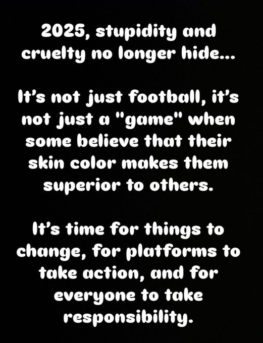 韋斯利-福法納寫道:“2025年,人們已經(jīng)毫不掩飾自己的愚蠢和殘忍。當(dāng)有人認(rèn)為他們僅憑膚色就比別人更優(yōu)越時(shí),這不僅僅是足球的問(wèn)題,這不僅僅是一個(gè)比賽的問(wèn)題。”