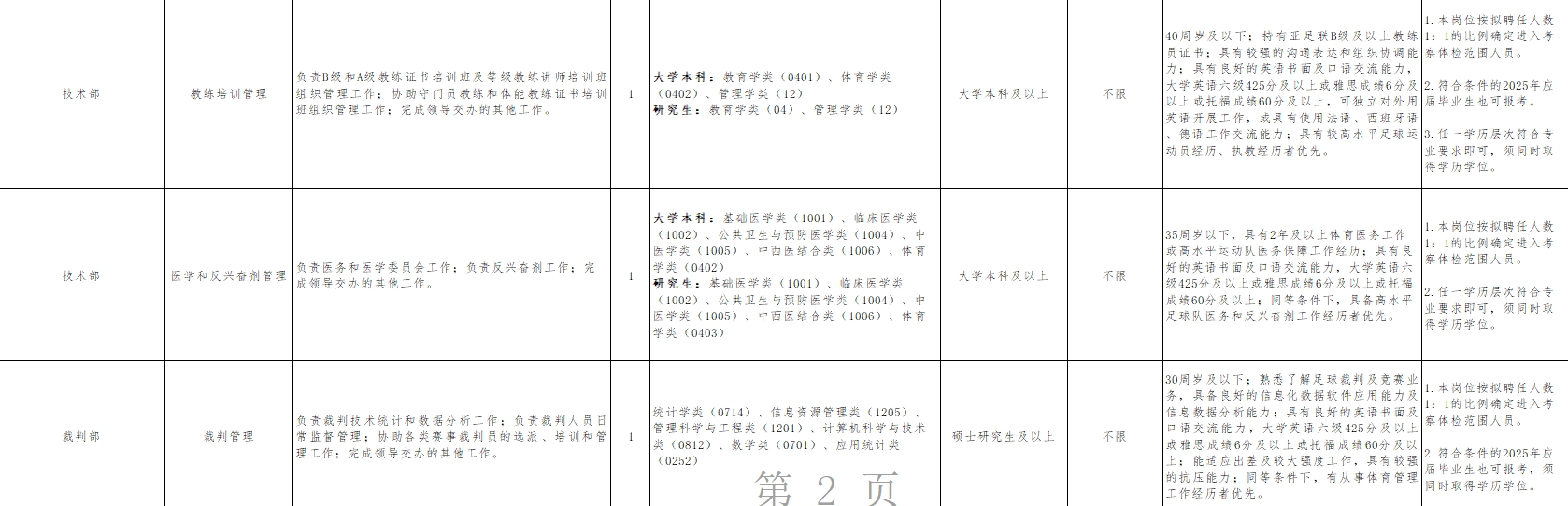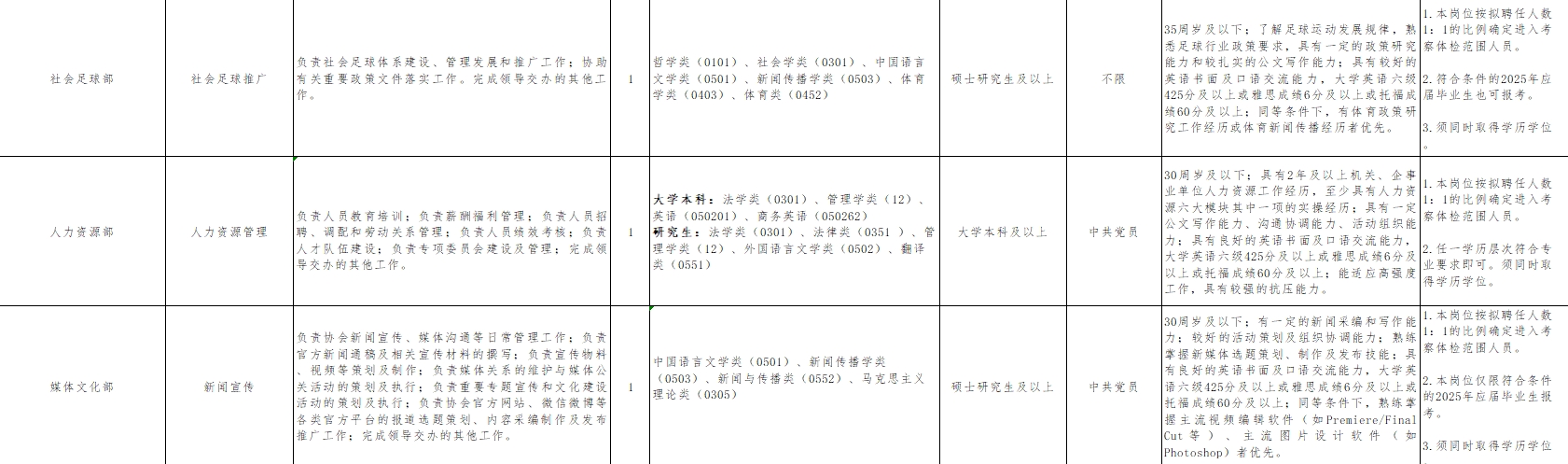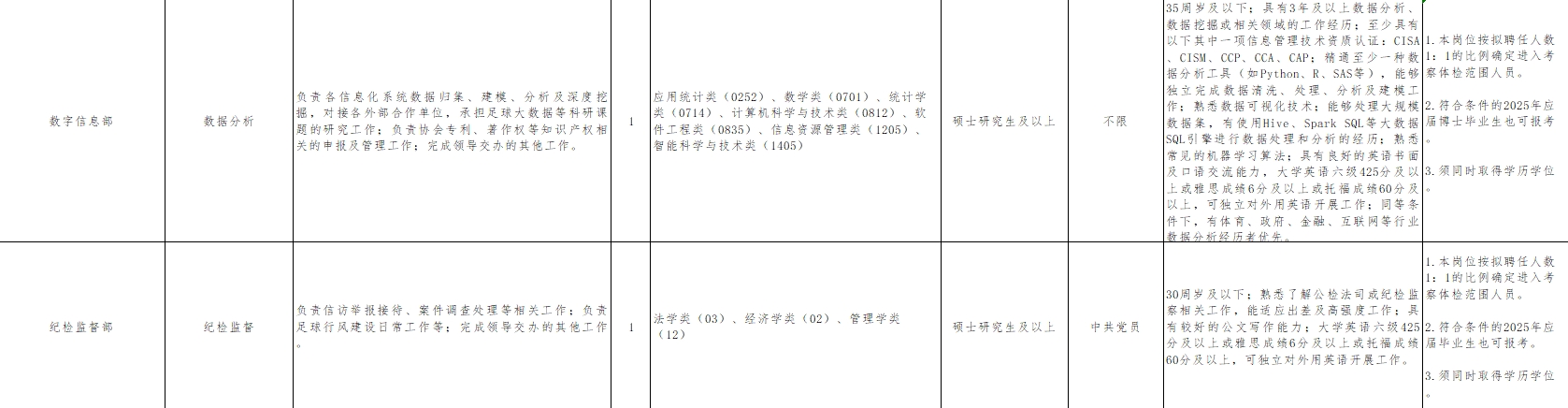 另外,綜合部(財務審核)、國家隊管理部(隊伍管理)、裁判部(裁判管理)、社會足球部(社會足球推廣)、媒體文化部(新聞宣傳)、數字信息部(數據分析)、紀檢監(jiān)督部(紀檢監(jiān)督)要求學歷為碩士研究生及以上,其余崗位為大學本科及以上。