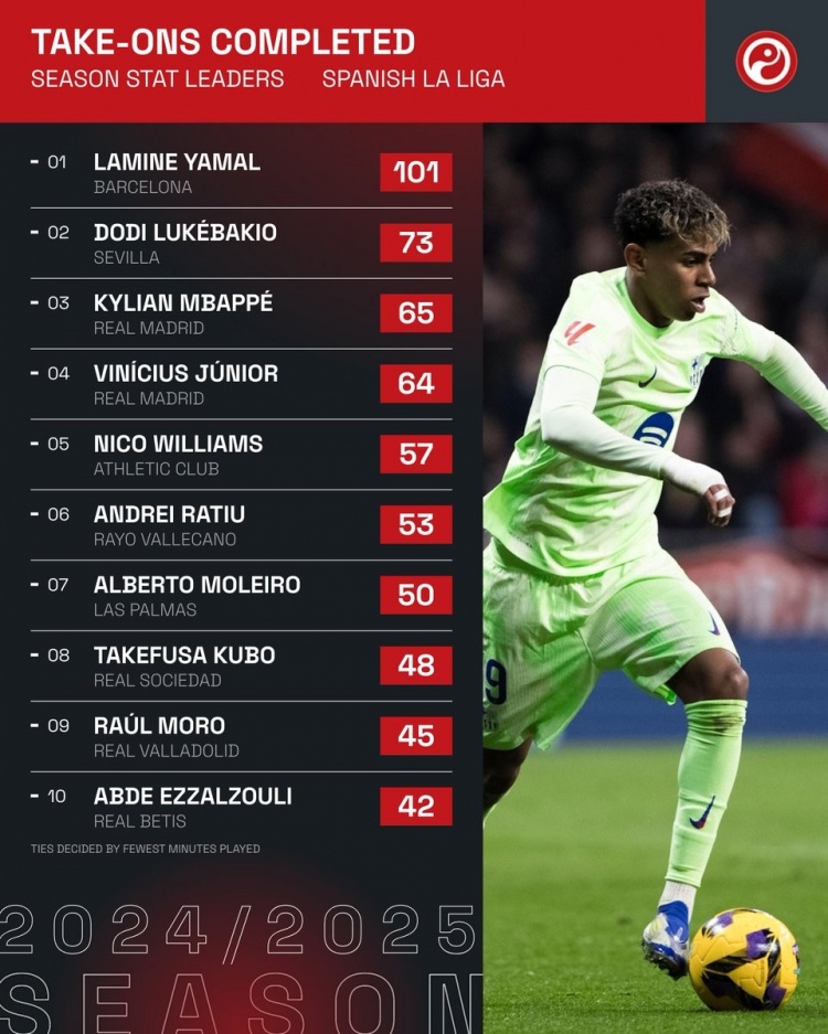 2025-03-19 07:00:27本賽季西甲成功過人榜:亞馬爾斷崖領跑,姆巴佩、維尼修斯在列