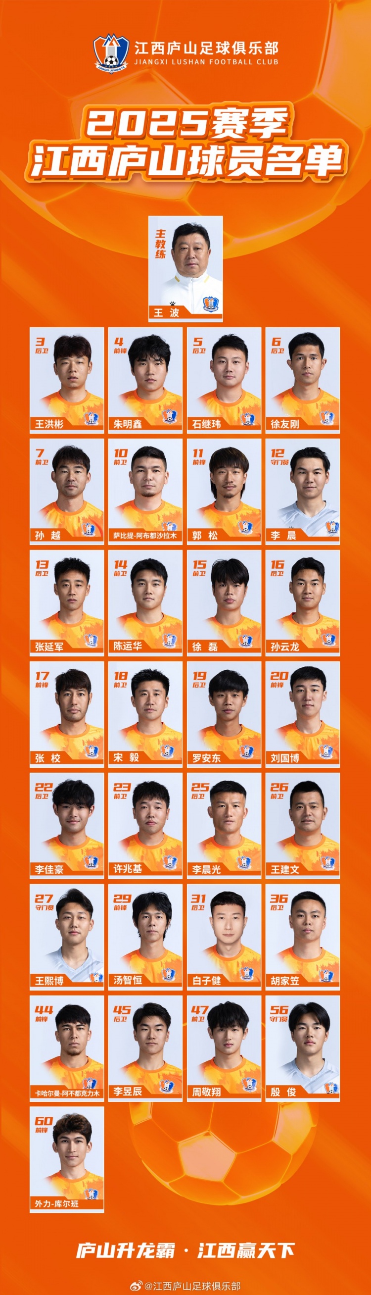 2025-03-19 14:00:53江西廬山足球俱樂部2025賽季球員大名單