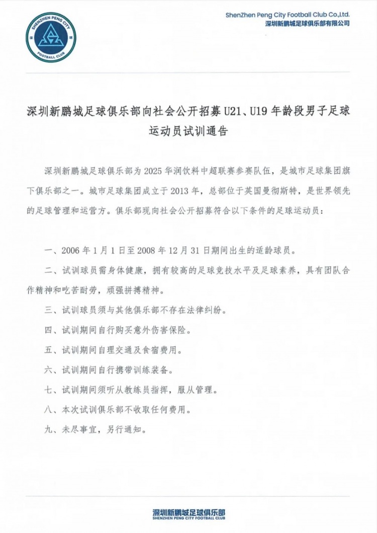 2025-03-19 21:01:39深圳新鵬城招募U21、U19、U17年齡段男子足球運(yùn)動(dòng)員試訓(xùn)通告