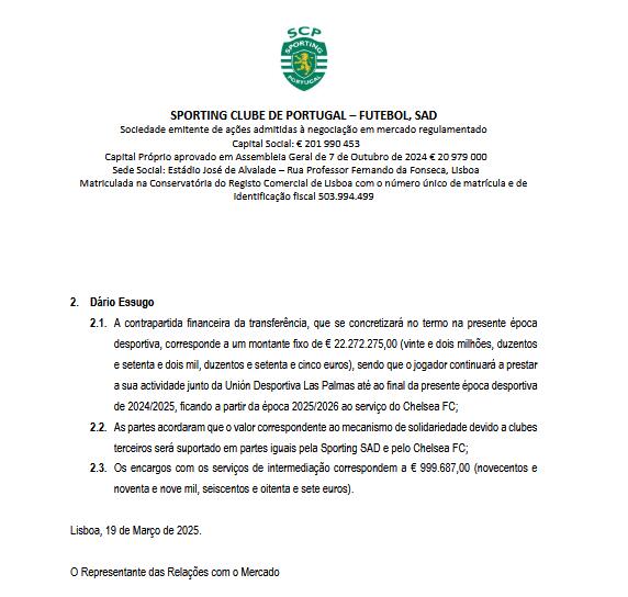 埃蘇戈轉(zhuǎn)會(huì)費(fèi)為22272275.00歐元(約2227萬(wàn)歐),將在本賽季結(jié)束時(shí)支付。球員將繼續(xù)為拉斯帕爾馬斯效力至2024/2025賽季結(jié)束,并從2025/2026賽季開(kāi)始為切爾西效力。