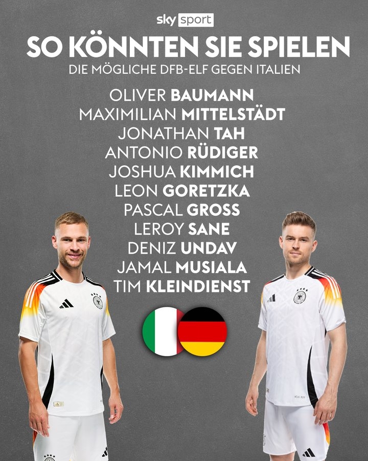 德天空預(yù)測(cè)德國(guó)隊(duì)首發(fā)如下:鮑曼、米特爾施塔特、若納坦-塔、呂迪格、基米希、格雷茨卡、格羅斯、薩內(nèi)、翁達(dá)夫、穆西亞拉、克萊因丁斯特