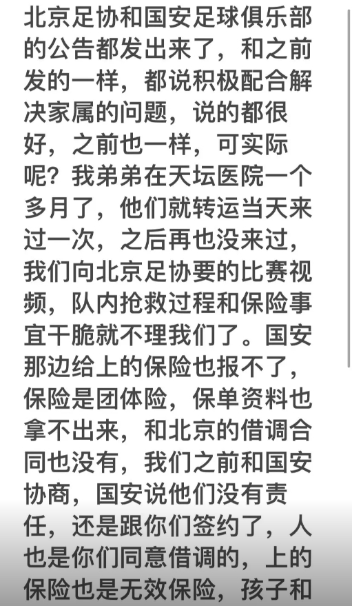 北京足協(xié)和國安足球俱樂部的公告都發(fā)出來了,和之前發(fā)的一樣,都說積極配合解決家屬的問題,說的都很好,之前也一樣,可實際呢?我弟弟在天壇醫(yī)院一個多月了,他們就轉(zhuǎn)運當天來過一次,之后再也沒來過,我們向北京足協(xié)要的比賽視頻,隊內(nèi)搶救過程和保險事宜干脆就不理我們了。