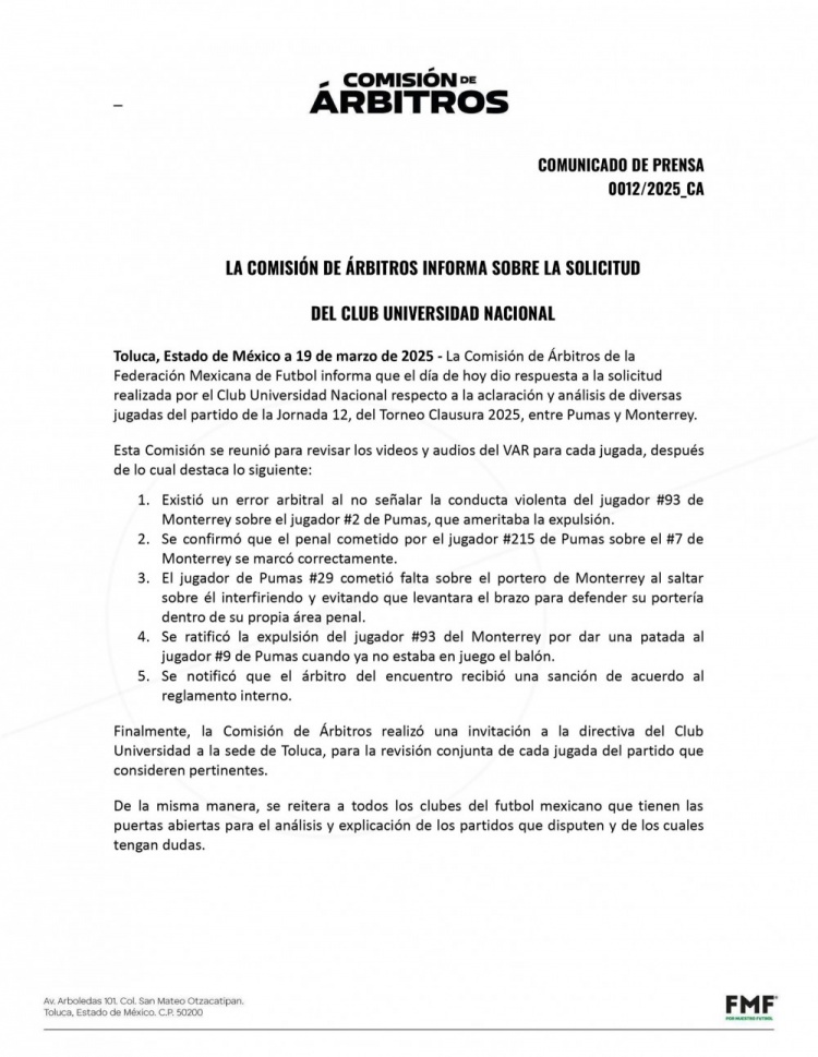 墨西哥美洲獅俱樂部賽后提出申請(qǐng),希望墨西哥裁判委員會(huì)對(duì)比賽中的判罰做出澄清和分析,裁判委員會(huì)發(fā)布公告,確認(rèn)當(dāng)值主裁存在失誤,拉莫斯上半場(chǎng)肘擊對(duì)手就應(yīng)該被罰下,但裁判沒有對(duì)其出示紅牌。