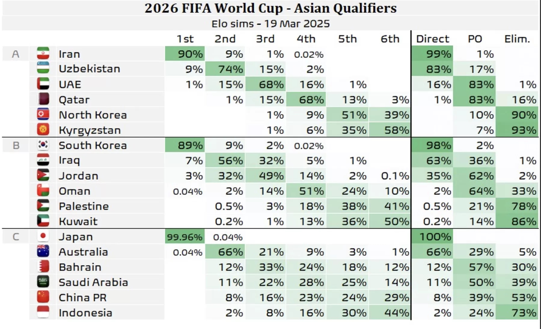 其中A組的伊朗(99%)、B組的韓國(guó)(98%)、C組的日本(100%)基本鎖定了直通世界杯的名額。
