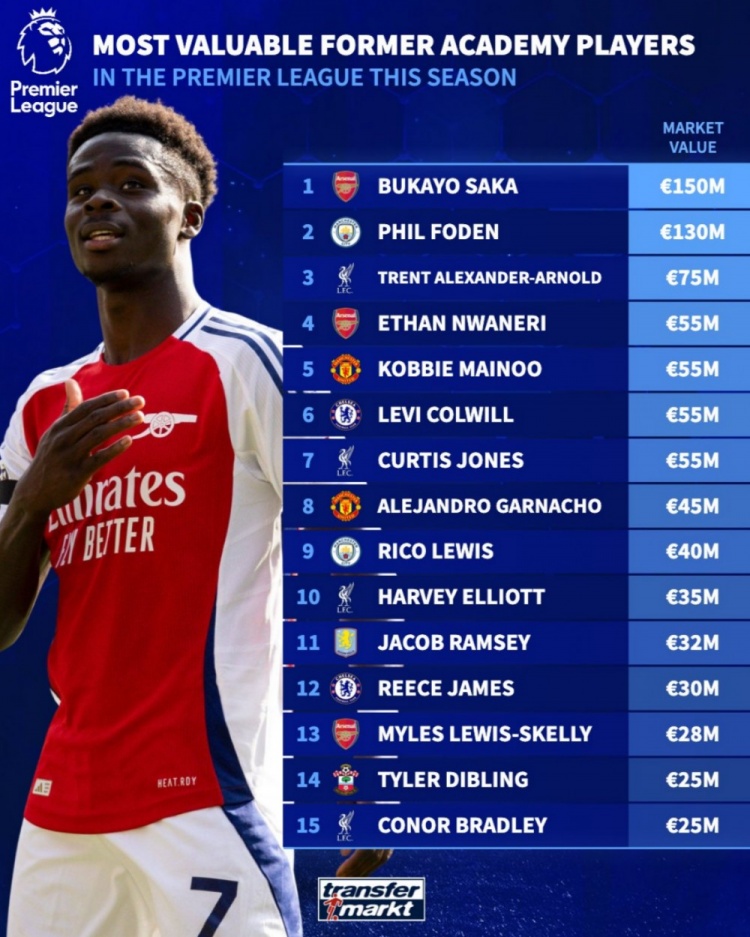 2025-03-20 21:00:25本賽季英超出自球隊青訓(xùn)球員身價榜:薩卡居首,福登&阿諾德在列