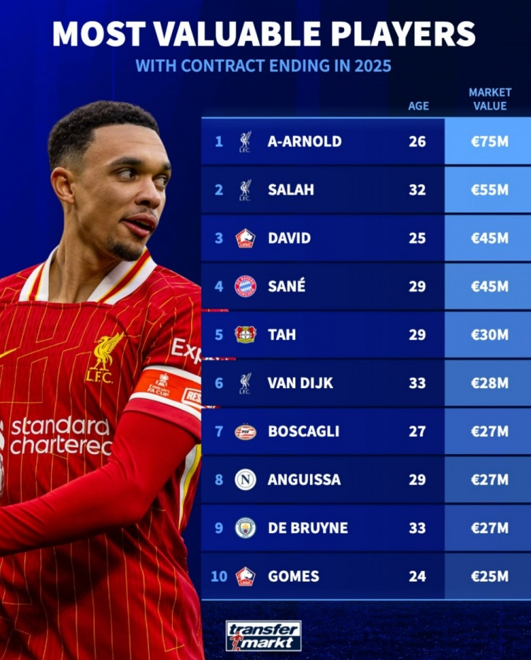 2025-03-20 21:00:36德轉(zhuǎn)列合同年球員身價(jià)榜:阿諾德居首,薩拉赫次席,薩內(nèi)在列