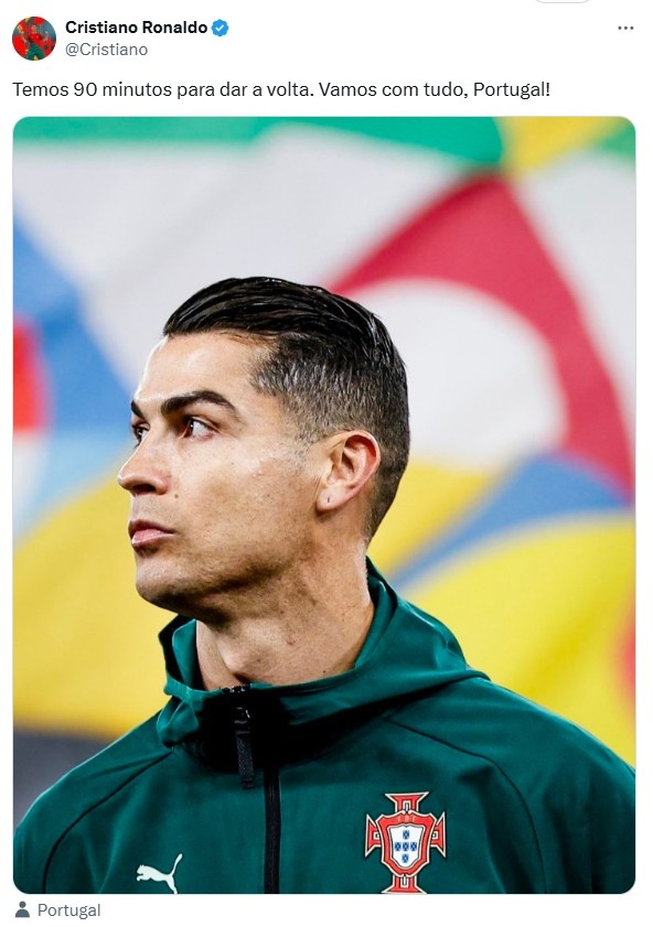 C羅曬出了自己的照片,并配文寫道:“我們有90分鐘的時(shí)間扭轉(zhuǎn)局面,讓我們?nèi)σ愿?,葡萄牙!?/span>