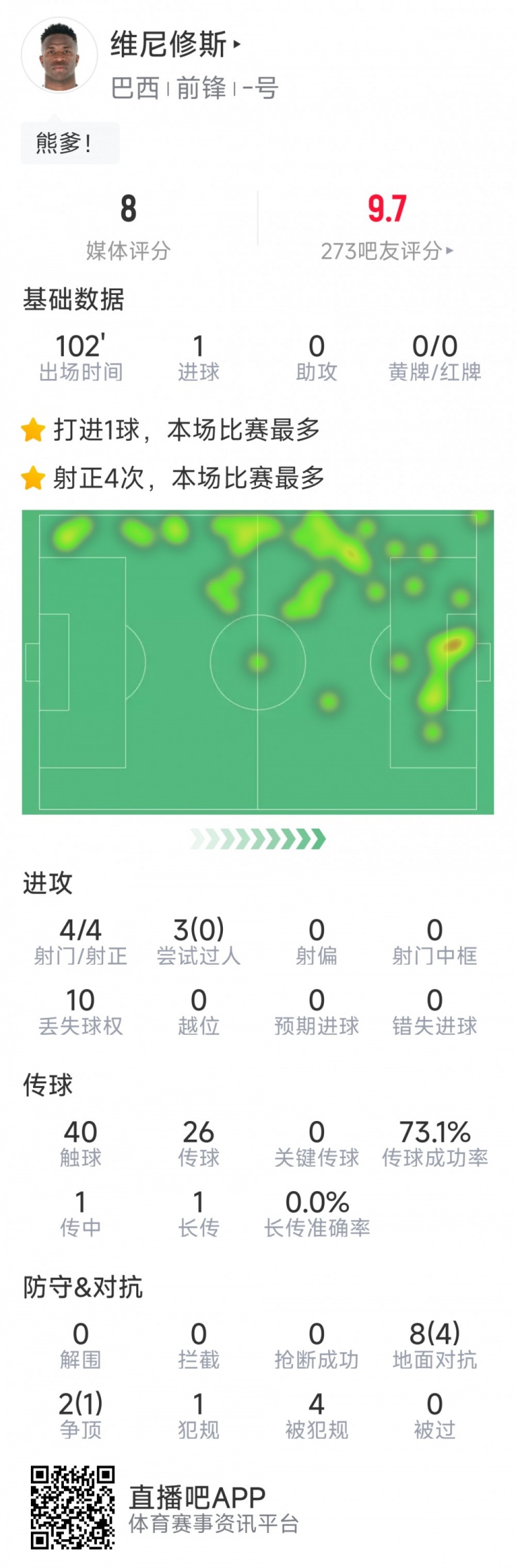 2025-03-21 14:01:00維尼修斯本場(chǎng)數(shù)據(jù):打進(jìn)絕殺,4次射門均射正,5次成功對(duì)抗