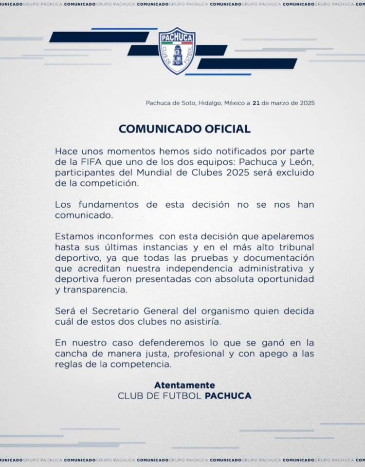 帕丘卡表示,國際足聯(lián)已通知兩支墨西哥球隊(帕丘卡和萊昂)中的一支將被排除在2025年世俱杯之外,但未向俱樂部說明具體理由。對此決定,帕丘卡俱樂部表示不滿,并計劃上訴至最高體育法庭。