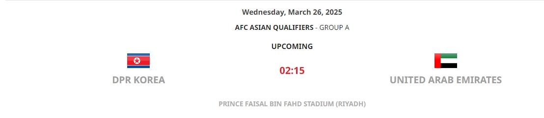2025-03-22 14:01:19亞足聯(lián)官網(wǎng)顯示:朝鮮主場對陣阿聯(lián)酋的比賽,將在沙特利雅得進行