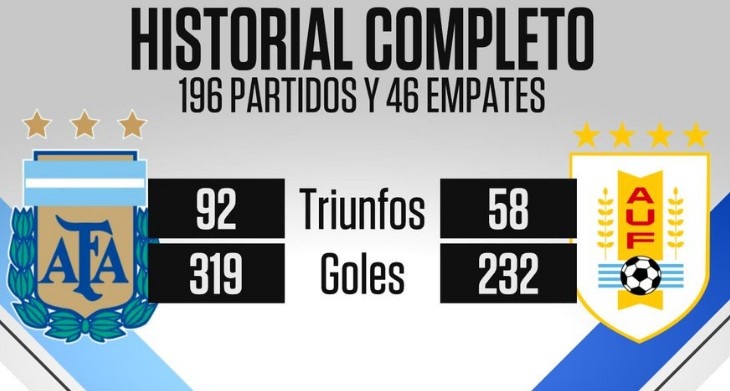 據(jù)統(tǒng)計(jì),這是阿根廷與烏拉圭兩支南美老牌強(qiáng)隊(duì)歷史上第196次交鋒,阿根廷的戰(zhàn)績(jī)?yōu)?2勝46平58負(fù),打進(jìn)319球,丟232球。