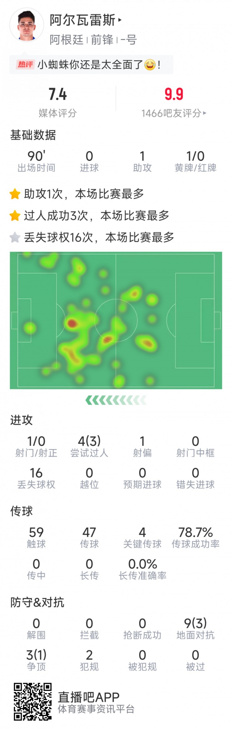 2025-03-22 14:01:25阿爾瓦雷斯本場數(shù)據(jù):1次助攻,4次關(guān)鍵傳球,3次成功過人