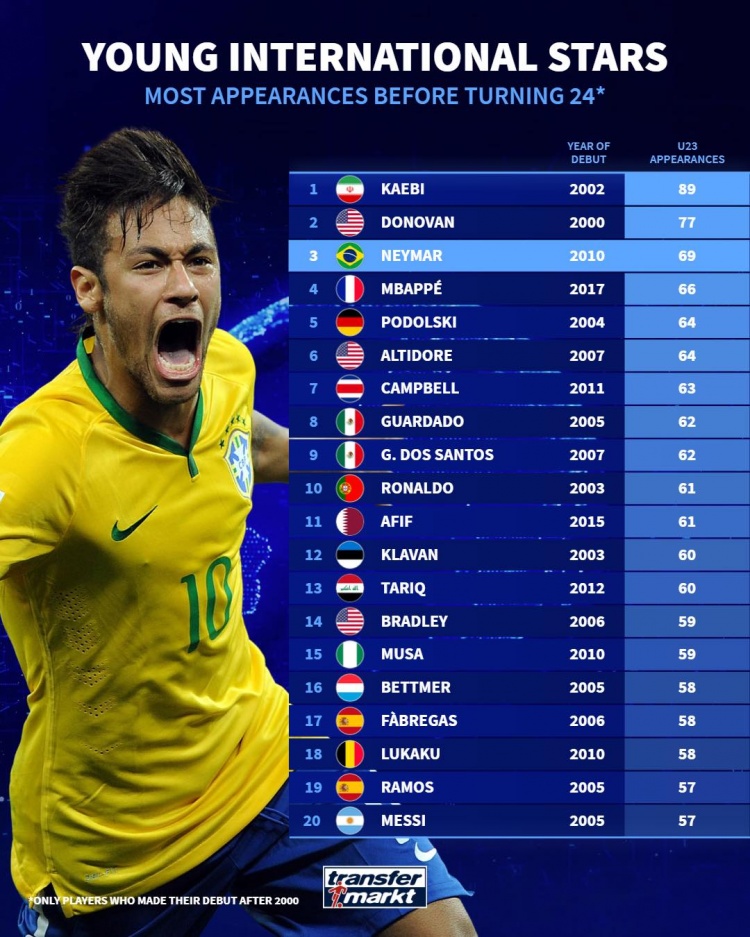 2025-03-23 07:00:1024歲之前國家隊出場榜:內馬爾69場第三,C羅61場&梅西57場