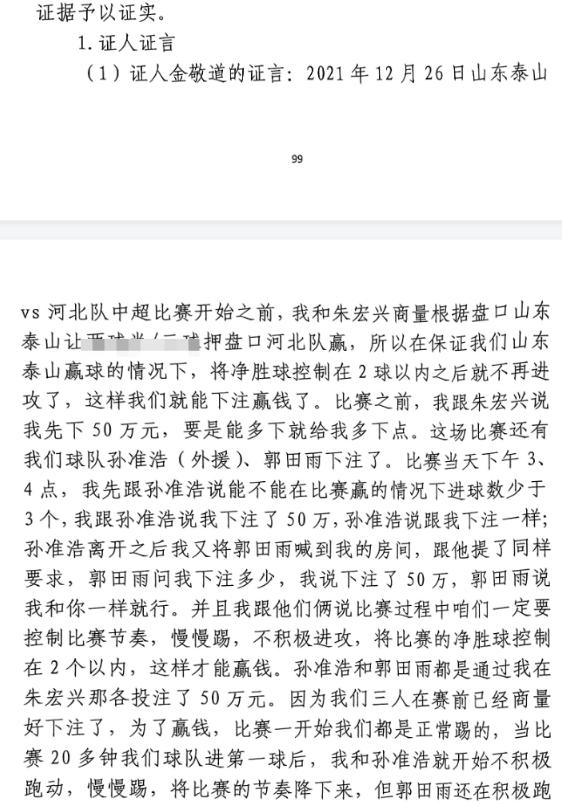 昨日網(wǎng)傳足壇假賭黑判決書,2021年12月26日山東泰山隊2-0河北隊的比賽中,金敬道和孫準浩、郭田雨下注買球。
