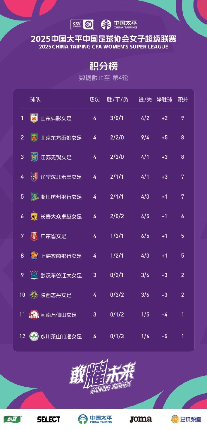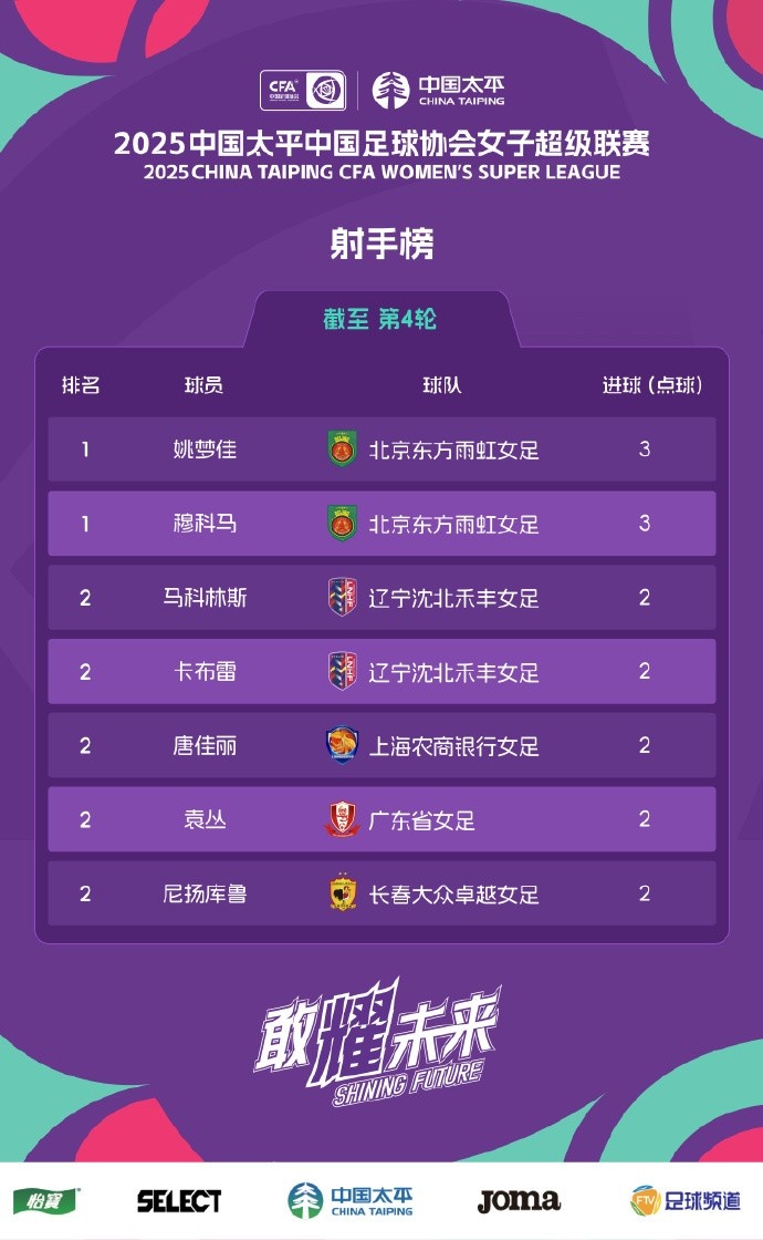 2025-03-23 21:00:23女超聯(lián)賽第4輪積分榜&射手榜