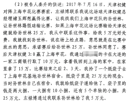 被告人秦升的供述:2017年1月16日,天津權(quán)健對陣上海申花比賽賽前,左祿博聯(lián)系我說這場球天津權(quán)健總經(jīng)理褚玉輝想贏得比賽,讓我找我們上海申花隊的孫世林,讓孫世林踢假球輸比賽,如果上海申花這場比賽輸給天津權(quán)健就給孫世林25萬,我從中聯(lián)系這件事,給我5萬元好處費,我就找到孫世林,說在場上松點踢,意思就是在比賽中放水的意思,承諾賽后給孫世林25萬,孫世林同意了,賽后天津權(quán)健3:0贏了上海申花,我通過的XXX卡在大連的一家工商銀行取了10萬元,拿著錢回到上海的家中,在家里拿了15萬,比賽結(jié)束之后2、3天,我拎了一個紙袋子去了上海申花基地孫世林宿舍,紙袋子里是25萬元的現(xiàn)金,當(dāng)時孫世林自己在宿舍,我就給紙袋子遞給他了。袋子里的錢是兩大捆,一大捆有10小捆,還有5個單獨的小捆,共25萬元。左祿博通過我聯(lián)系孫世林給了我5萬元。