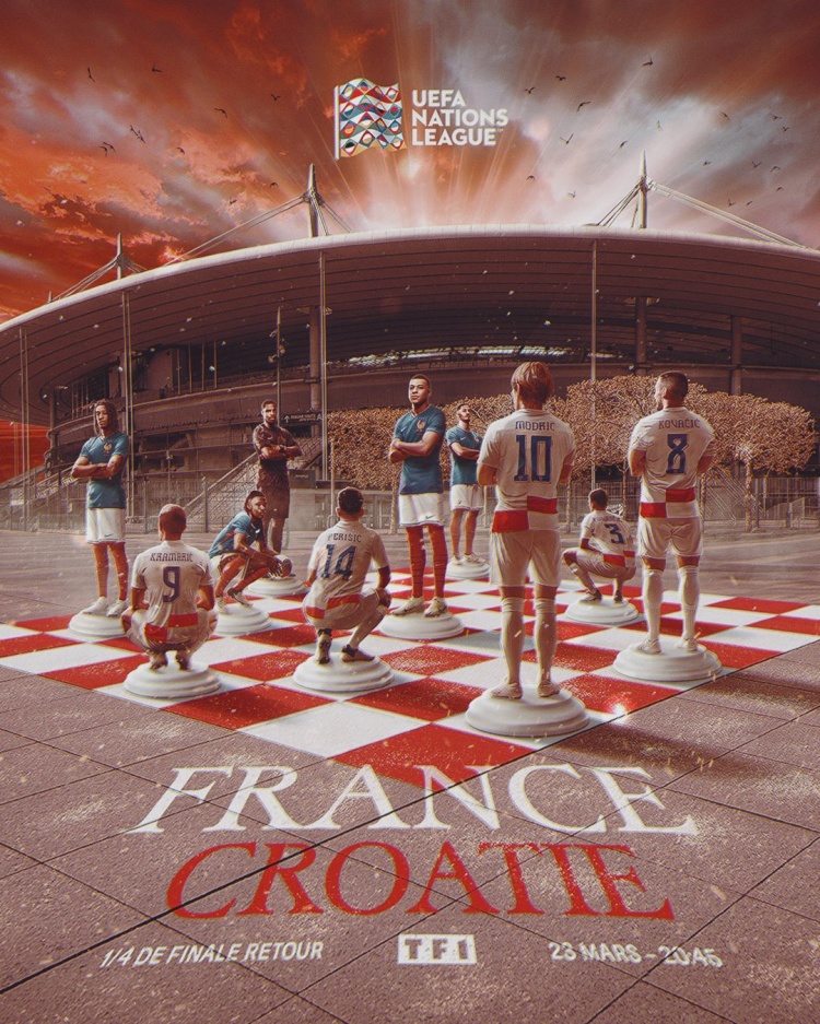 法國隊(duì)官方社媒發(fā)布了為次回合制作的海報(bào),內(nèi)容為兩隊(duì)球員在球場(chǎng)外的棋盤上對(duì)峙,姆巴佩、莫德里奇領(lǐng)銜出鏡。