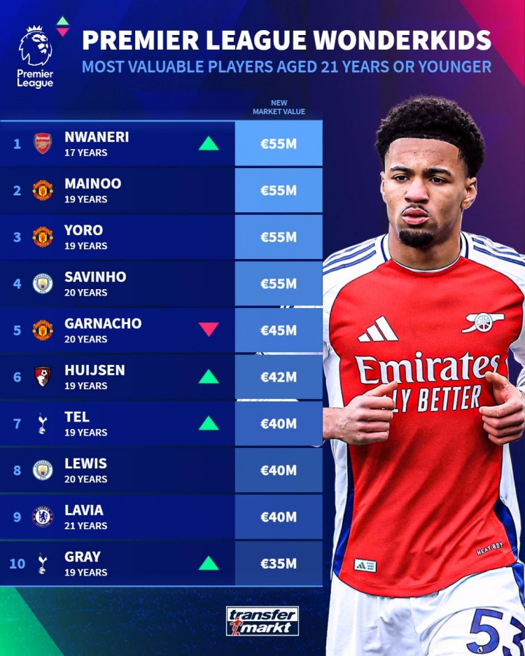 2025-03-23 21:01:47英超U21身價榜:恩瓦內(nèi)里、梅努、約羅、薩維尼奧5500萬歐居首