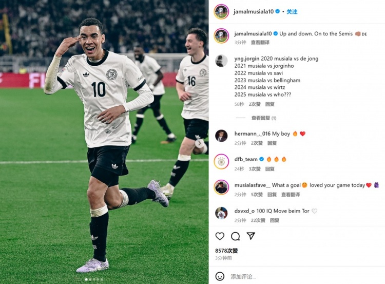 2025-03-24 07:00:11角球偷襲得手!穆西亞拉社媒曬照:有起有伏,晉級歐國聯(lián)四強(qiáng)!
