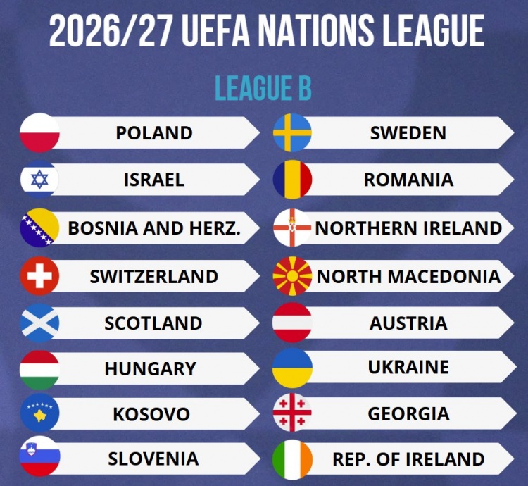 2025-03-24 07:00:22歐國聯(lián)2026-27賽季B級別球隊出爐:蘇格蘭、烏克蘭、波蘭在列