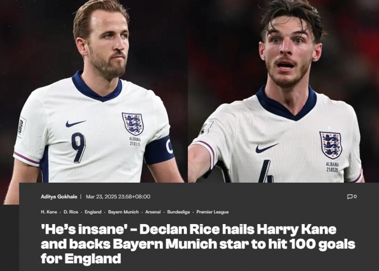 2025-03-24 07:01:39賴斯:凱恩能達成英格蘭隊百球成就,他是一名偉大的隊長