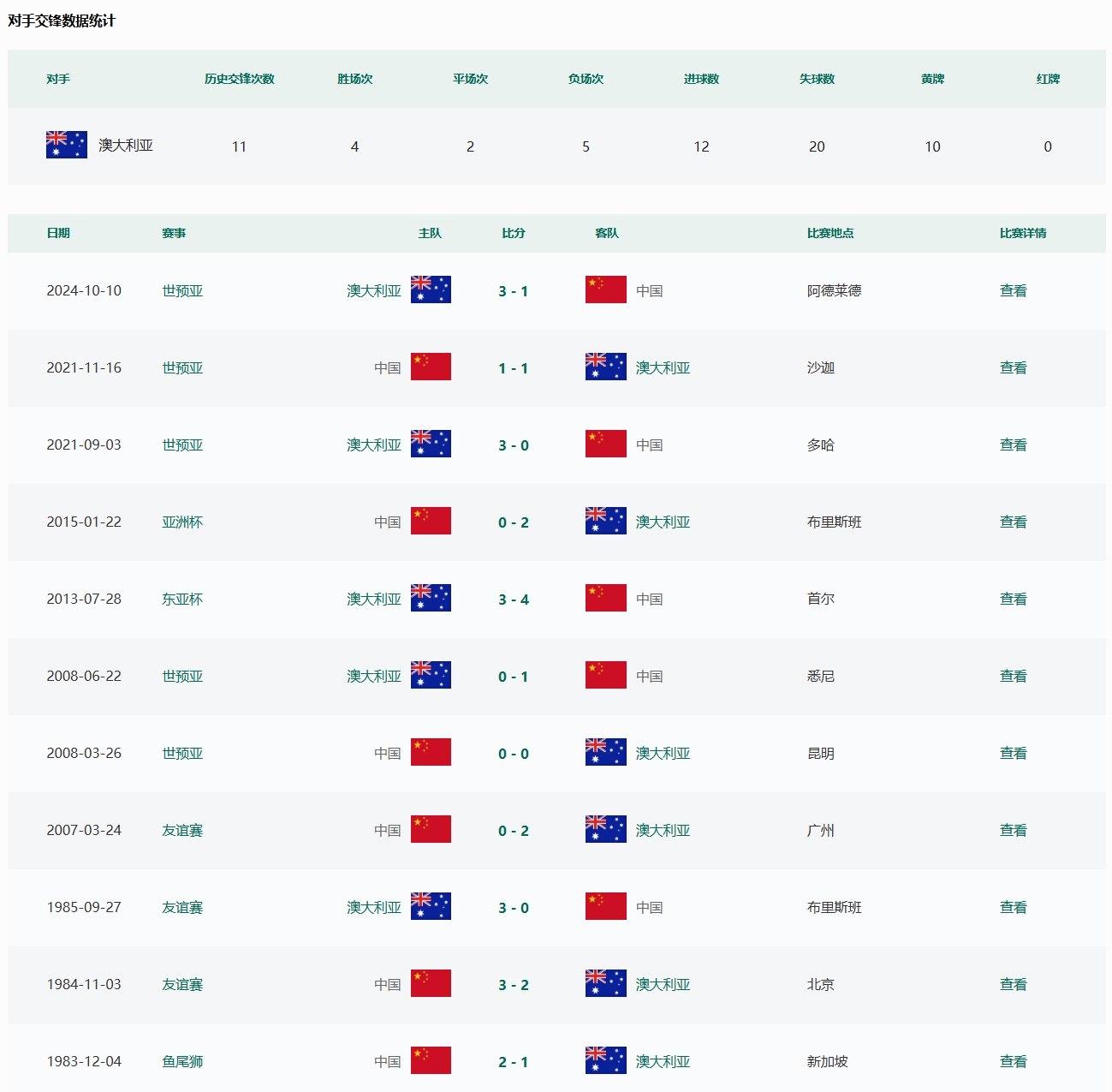 根據(jù)中國(guó)足協(xié)官網(wǎng)數(shù)據(jù)顯示,國(guó)足此前共11次交手澳大利亞,取得4勝2平5負(fù)的戰(zhàn)績(jī)。