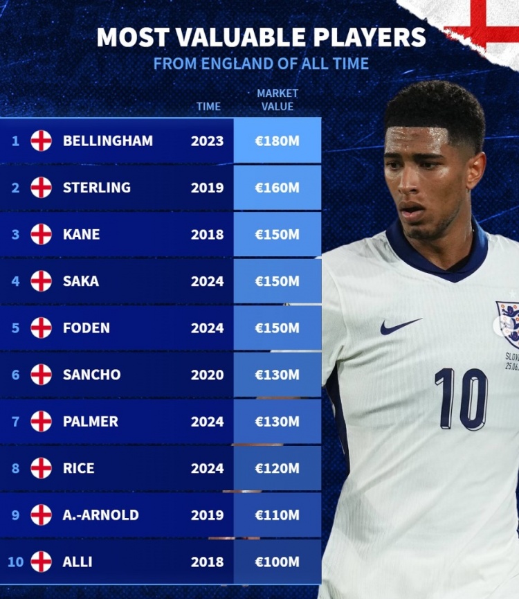 2025-03-25 07:00:18德轉(zhuǎn)列英格蘭隊(duì)史身價(jià)前十:貝林厄姆1.8億,斯特林、阿里均上億