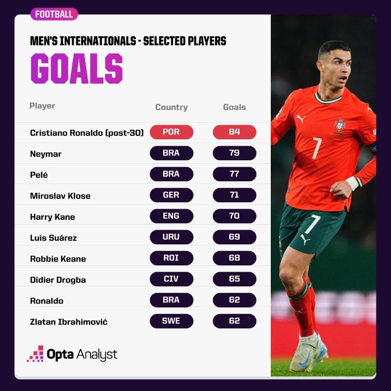2025-03-25 07:00:19越老越妖!30歲后C羅國家隊84球 超內(nèi)馬爾等眾星國家隊進球數(shù)
