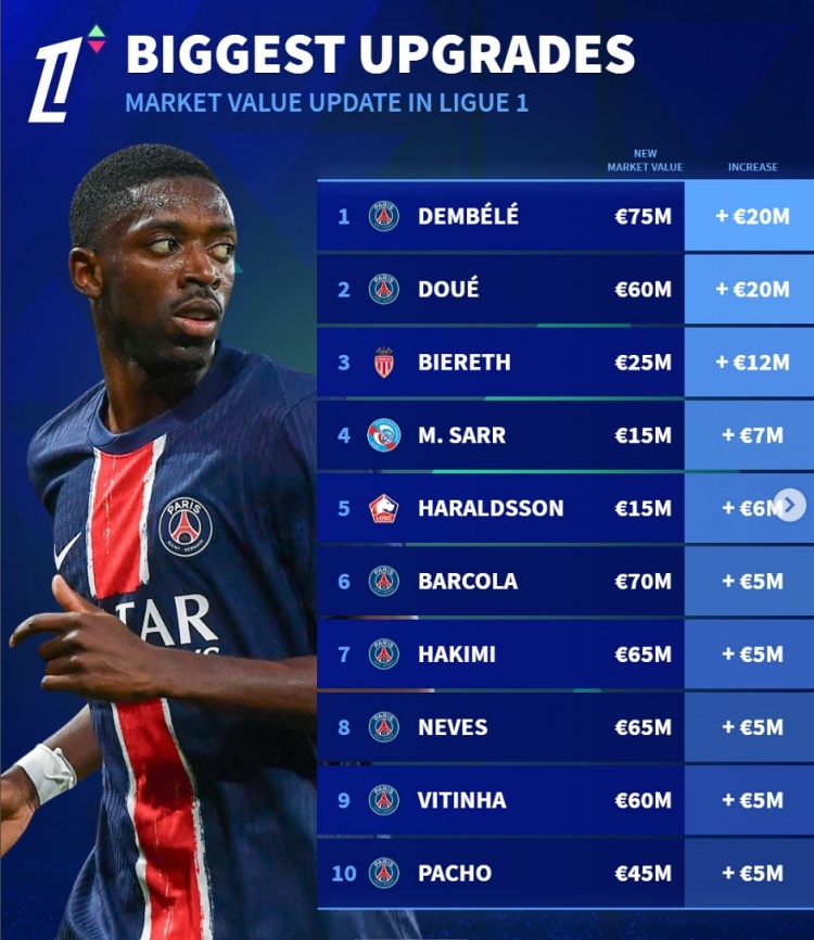 2025-03-25 07:00:28法甲身價更新升值榜:登貝萊&杜埃均上漲2000萬歐,比雷斯在列