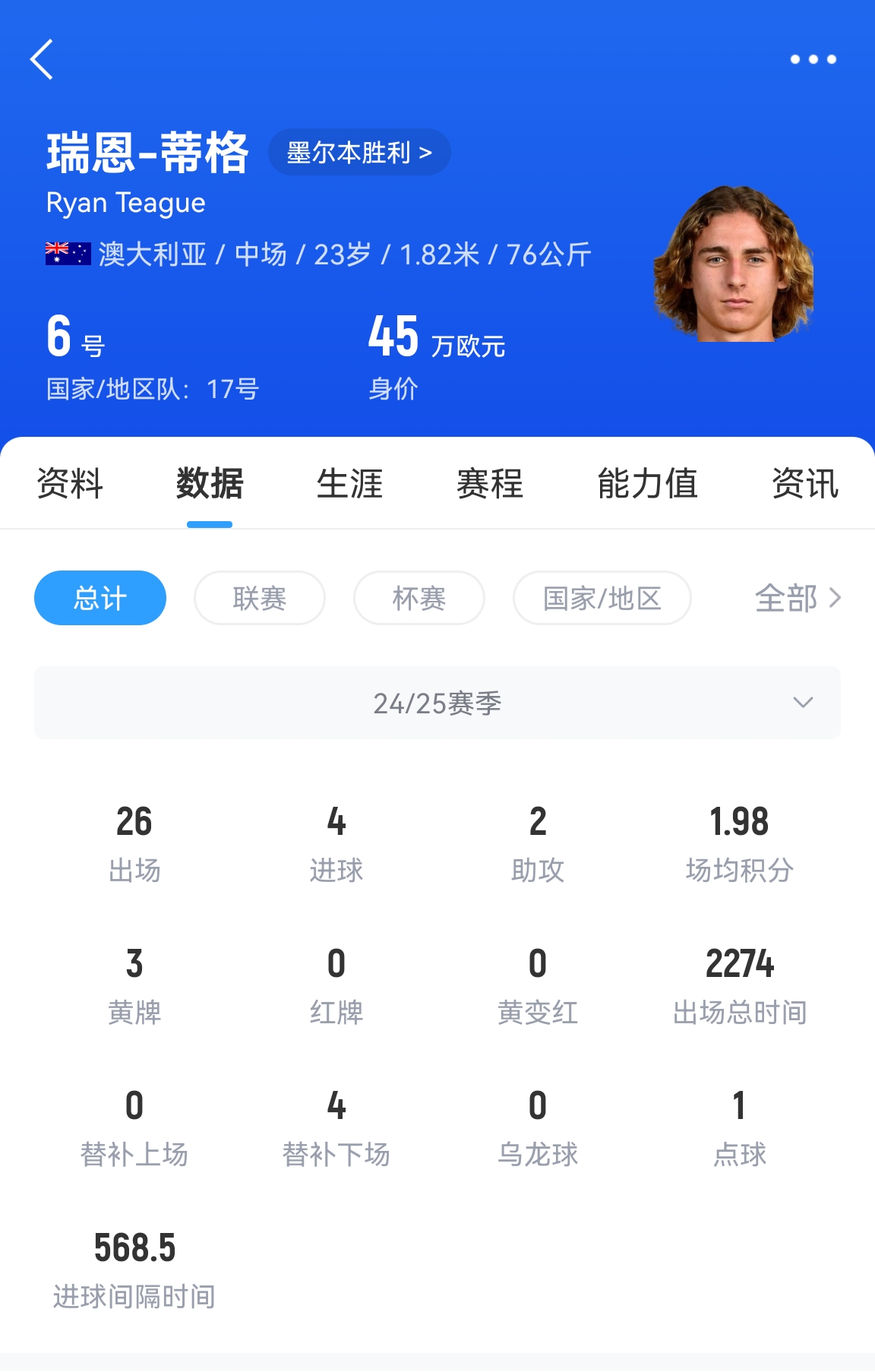 蒂格本賽季為墨爾本勝利出場(chǎng)26次打入4球2助攻,他的德轉(zhuǎn)身價(jià)為45萬歐元。