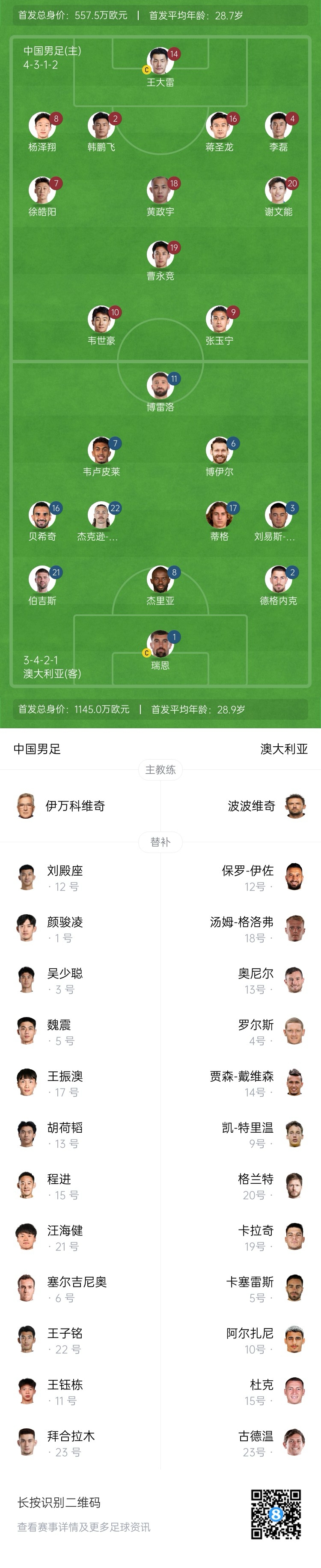 2025-03-25 21:02:30世預(yù)賽-中澳之戰(zhàn)首發(fā):韓鵬飛、楊澤翔先發(fā),塞鳥、王鈺棟替補(bǔ)